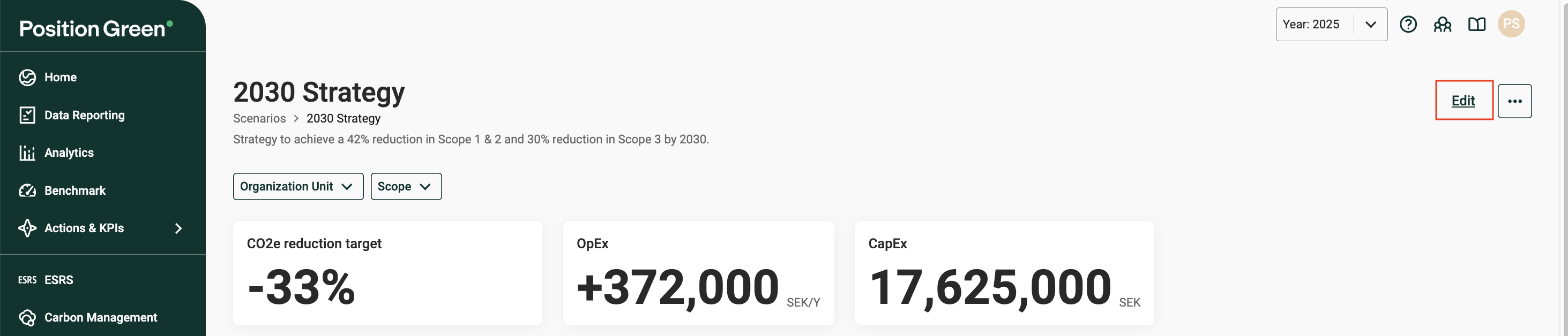 Sobald ein Szenario erstellt wurde, können Sie die Parameter jederzeit bearbeiten, indem Sie auf die Schaltfläche „Bearbeiten“ in der oberen rechten Ecke klicken.