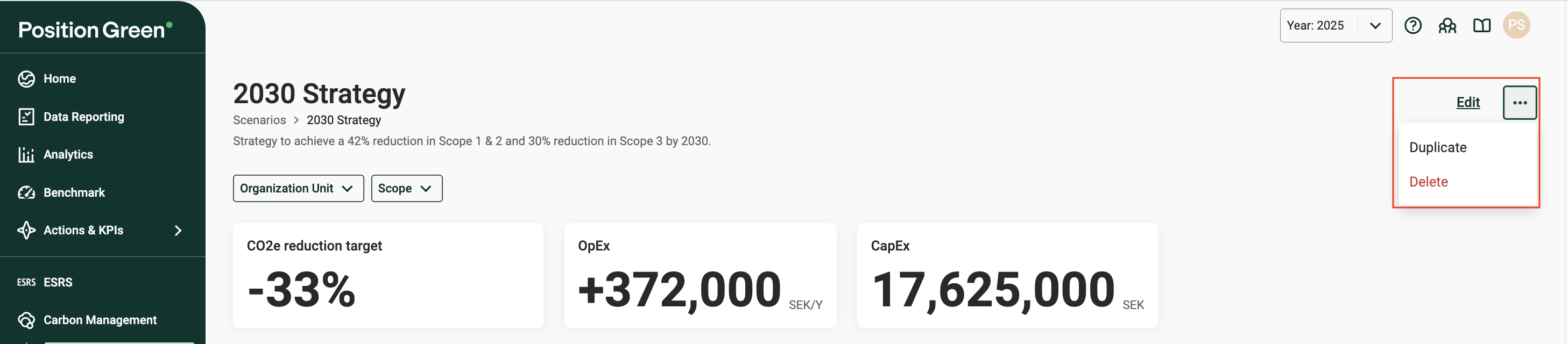 Sie können ein Szenario duplizieren oder löschen, indem Sie auf die drei Punkte in der oberen rechten Ecke klicken.