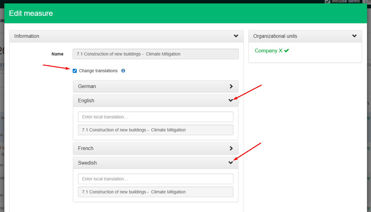 Schritt 3: Aktivieren Sie das Kontrollkästchen „Übersetzungen ändern“ und wählen Sie die Sprache aus, in der Sie den Standardnamen überschreiben möchten.