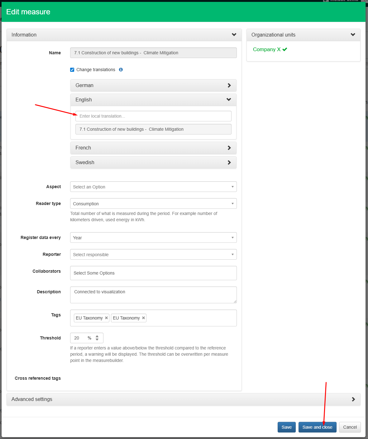 Schritt 4. Geben Sie den gewünschten Namen der Metrik in das Feld „Lokale Übersetzung eingeben“ ein und vergessen Sie nicht, nach Abschluss des Vorgangs auf „Speichern und schließen“ zu klicken.
