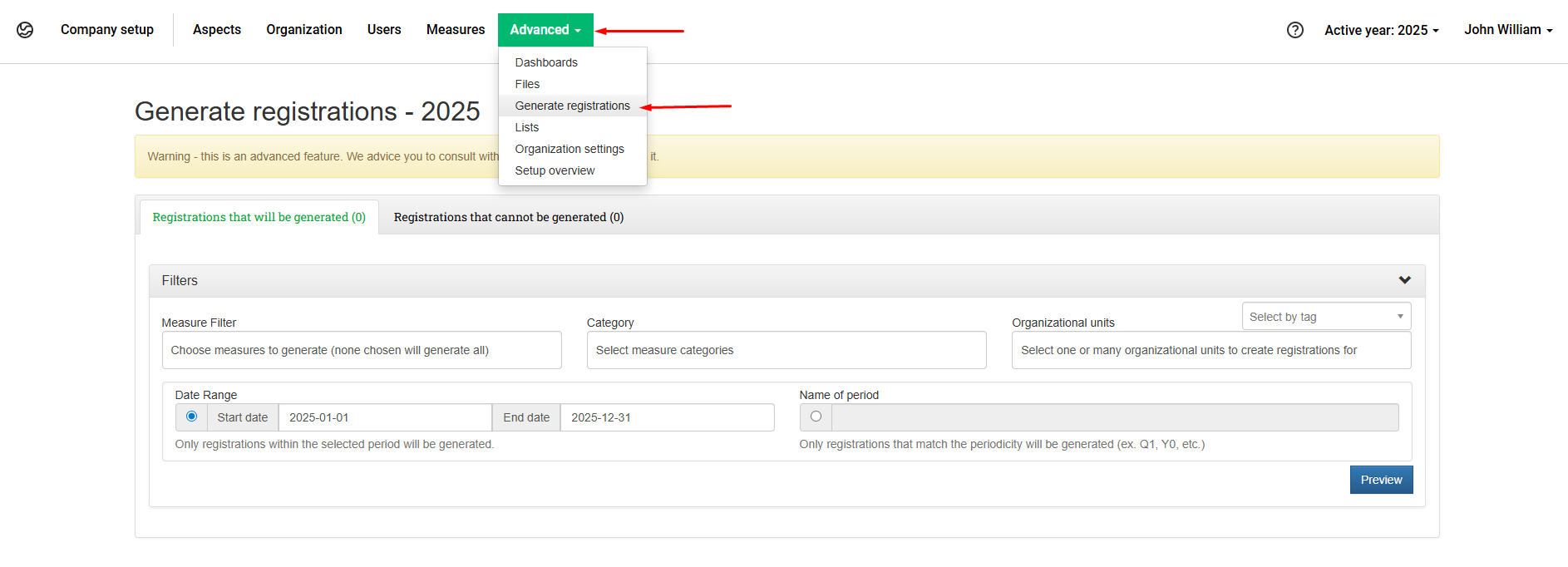 To generate a registration for reporting, all connections between the 4 elements of the setup must be set up. If the set up is not completed your registrations will be under Registrations that cannot be generated with a reason text. When all prerequisites are fulfilled registrations can be generated. Only measures that are not already published will be generated.