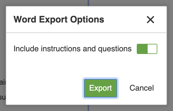 You can decide whether you want to include the questions and instructions when exporting your statement. When exporting a statement to Word, a pop-up window appears with export options. Use the toggle switch to choose whether to include or exclude questions in the export