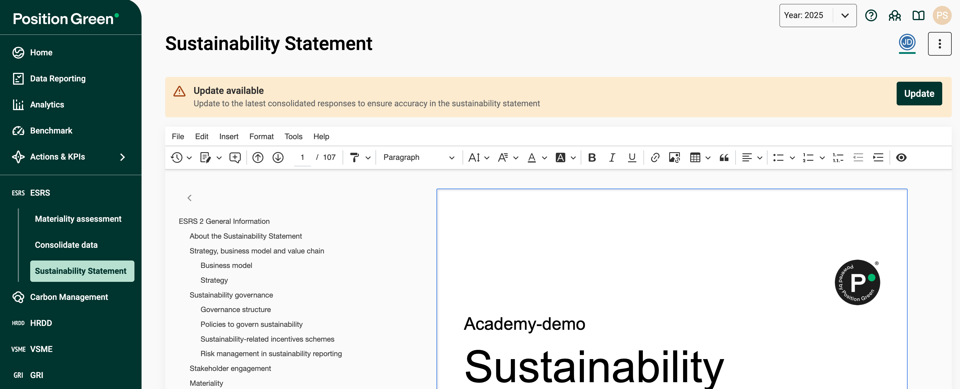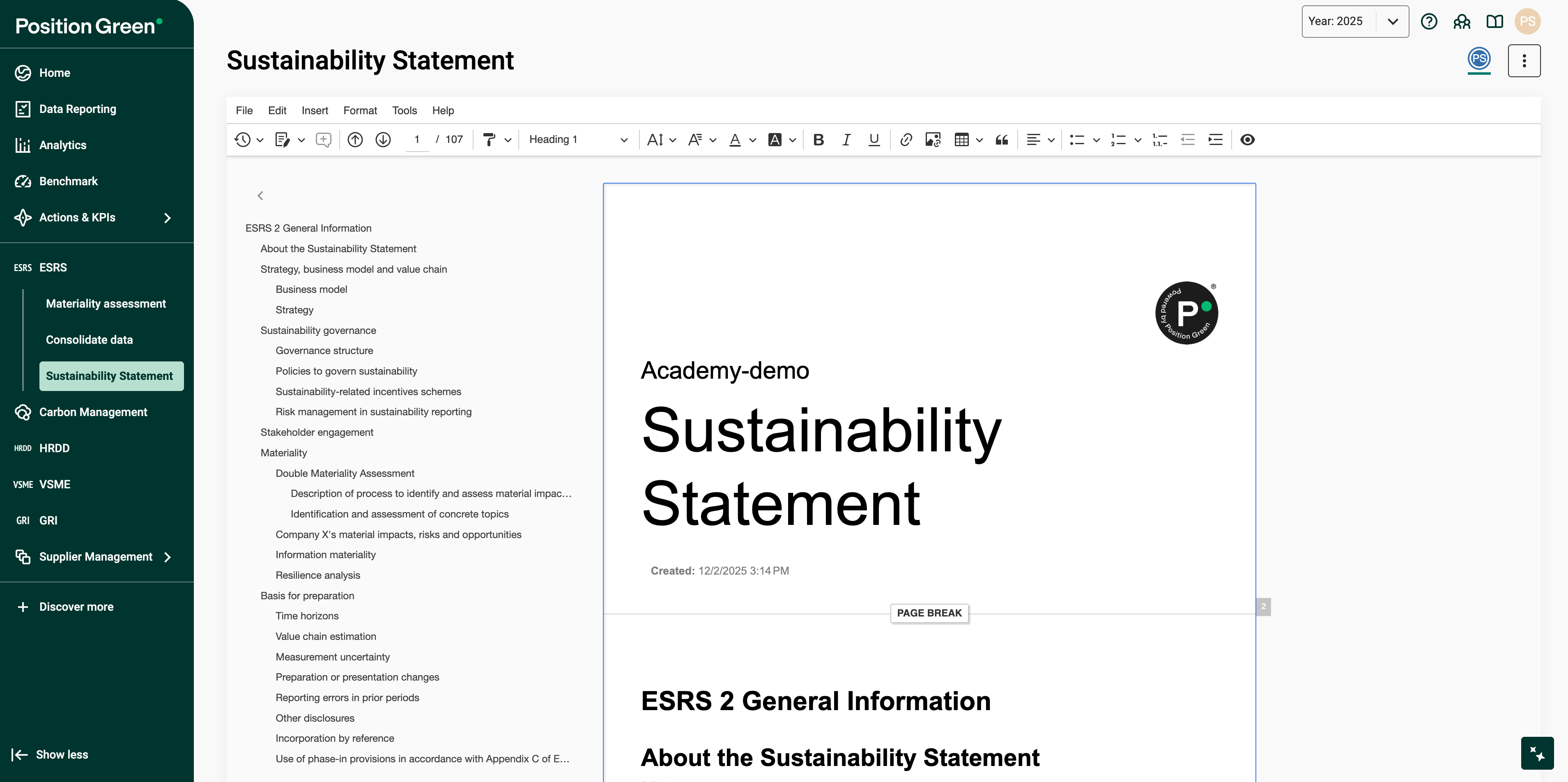 The Statement Editor enables you to create and work with your company's sustainability statement. All data from both automatic and manual consolidation is structured according to ESRS guidelines and Position Green's in-house Advisory expertise. The standard allows you to present information in a relevant way, rather than strictly following a datapoint-by-datapoint format.