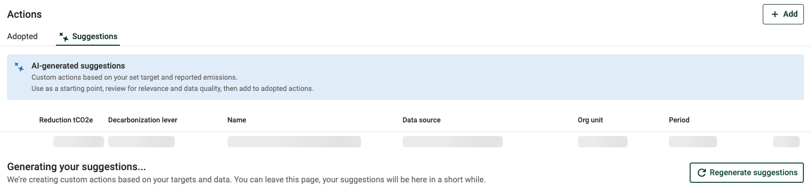 AI-generated suggestions provide starter ideas for your Decarbonization Strategy. Use them to explore options, then review and tailor before adopting.