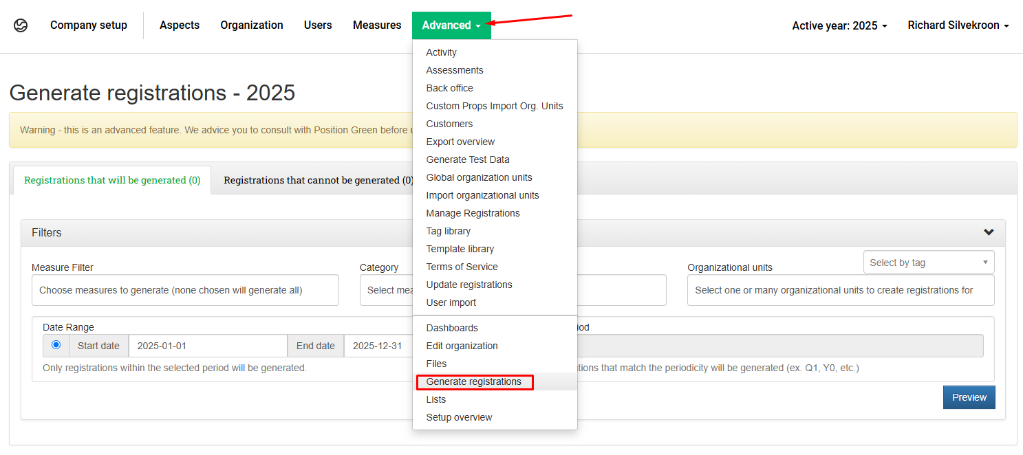 - To create entries using the new interval navigate to Company Setup → Advanced → Generate Registrations.