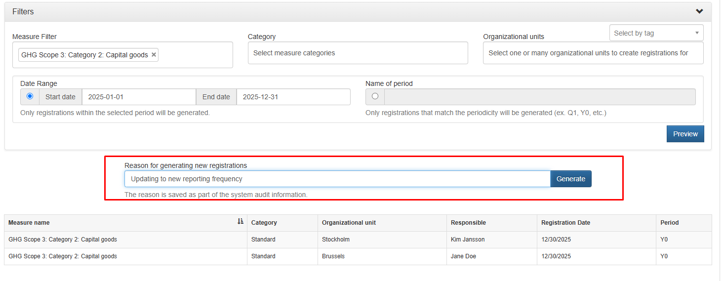 The reporting frequency in the Reporting View is not automatically linked to what is set in the Setup View. If the frequency is changed in the setup, it will not update automatically in existing registrations. You must manually remove old registrations that use the previous frequency and then generate new ones.