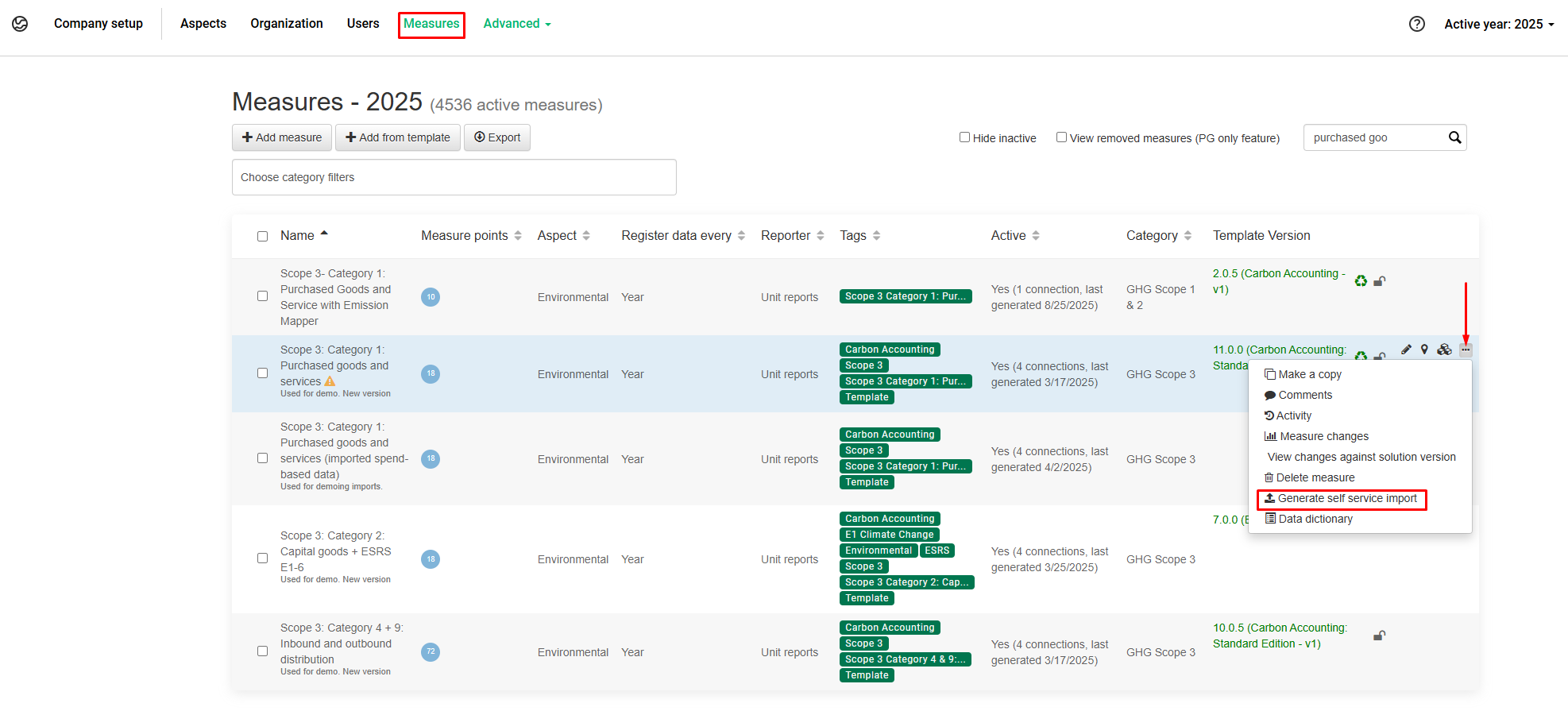 3. Search for or find the measure in the list into which you would like to import data via a generated import template.