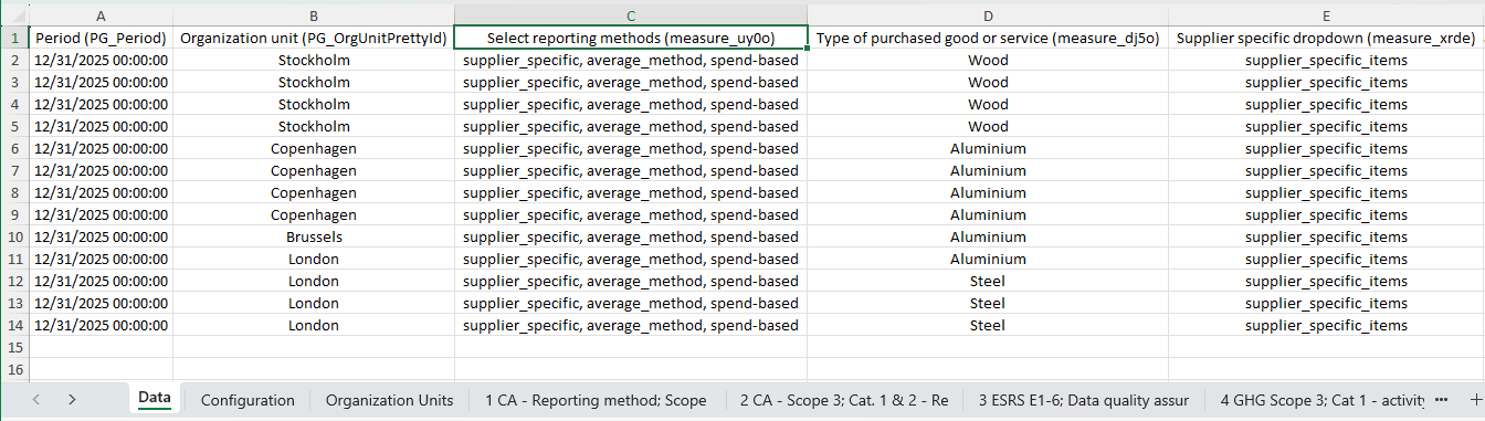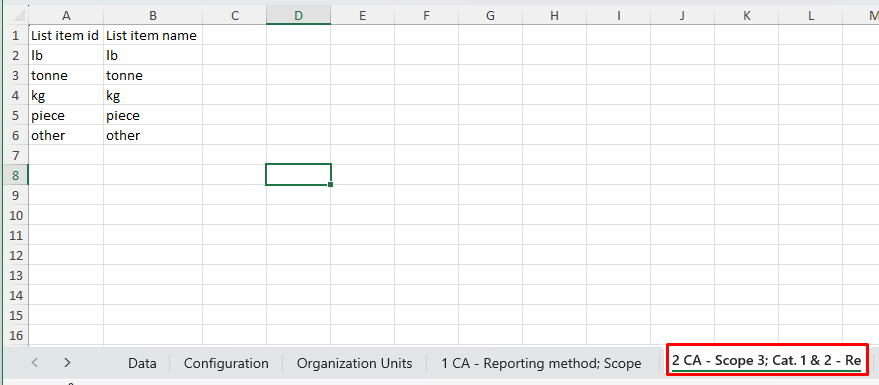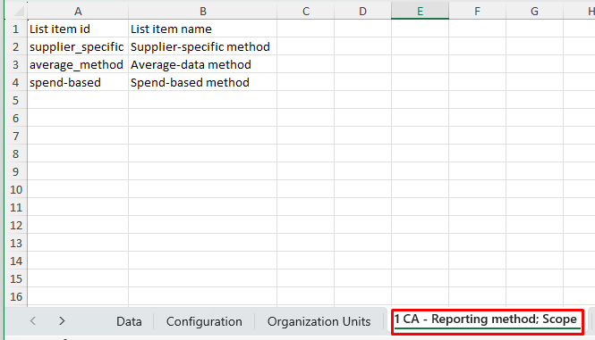 In column C the reporting methods should be listed for each purchased of goods, this is a multiple choice option and the sheet 1 CA - Reporting method; Scope can be used to see the available options:
