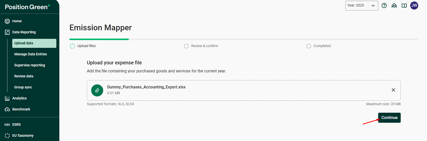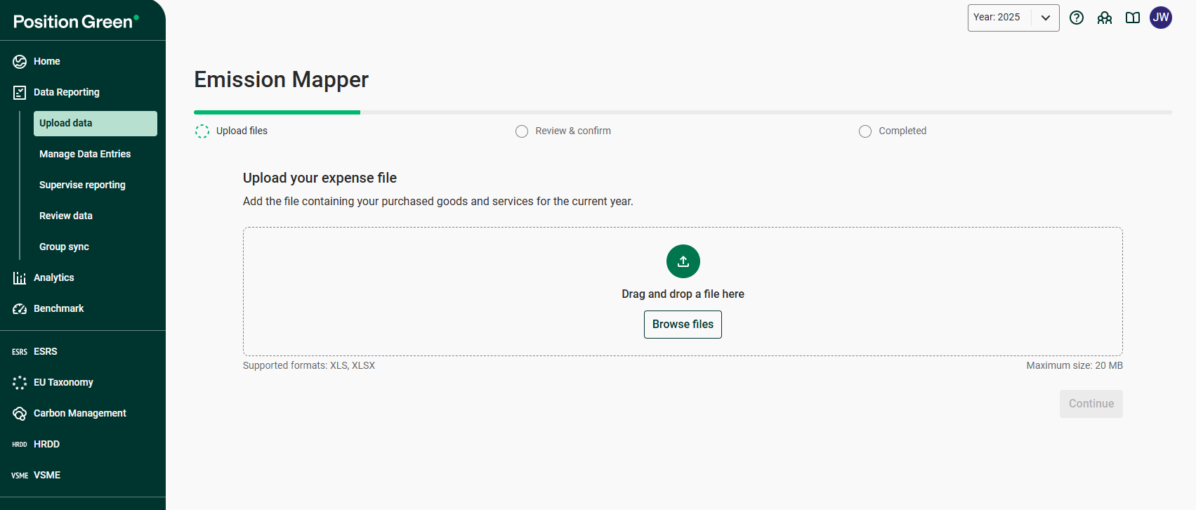 1. Go to Data Reporting in left menu, then select Upload data and click Start mapping emissions.