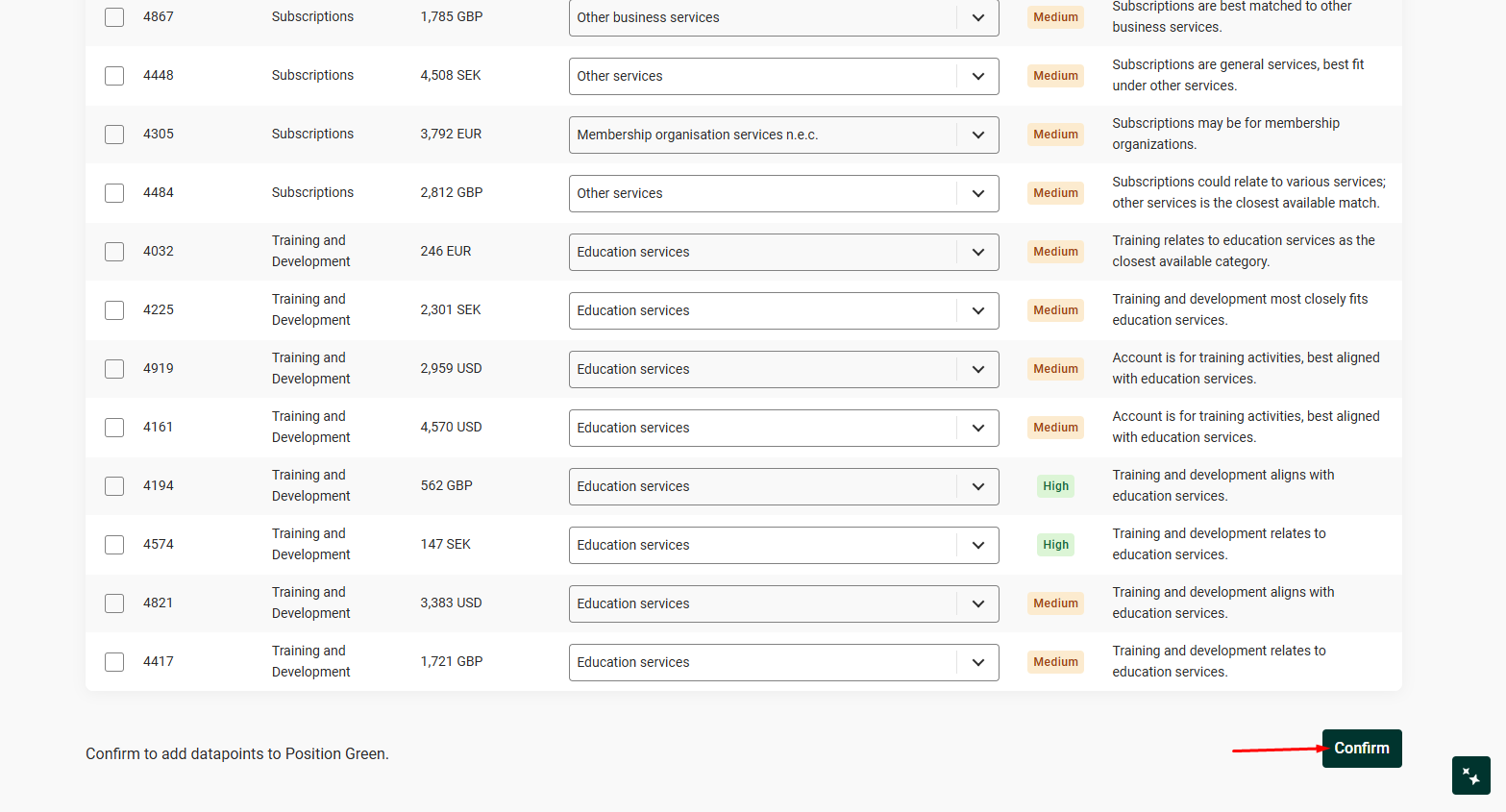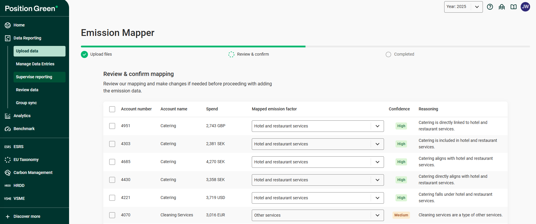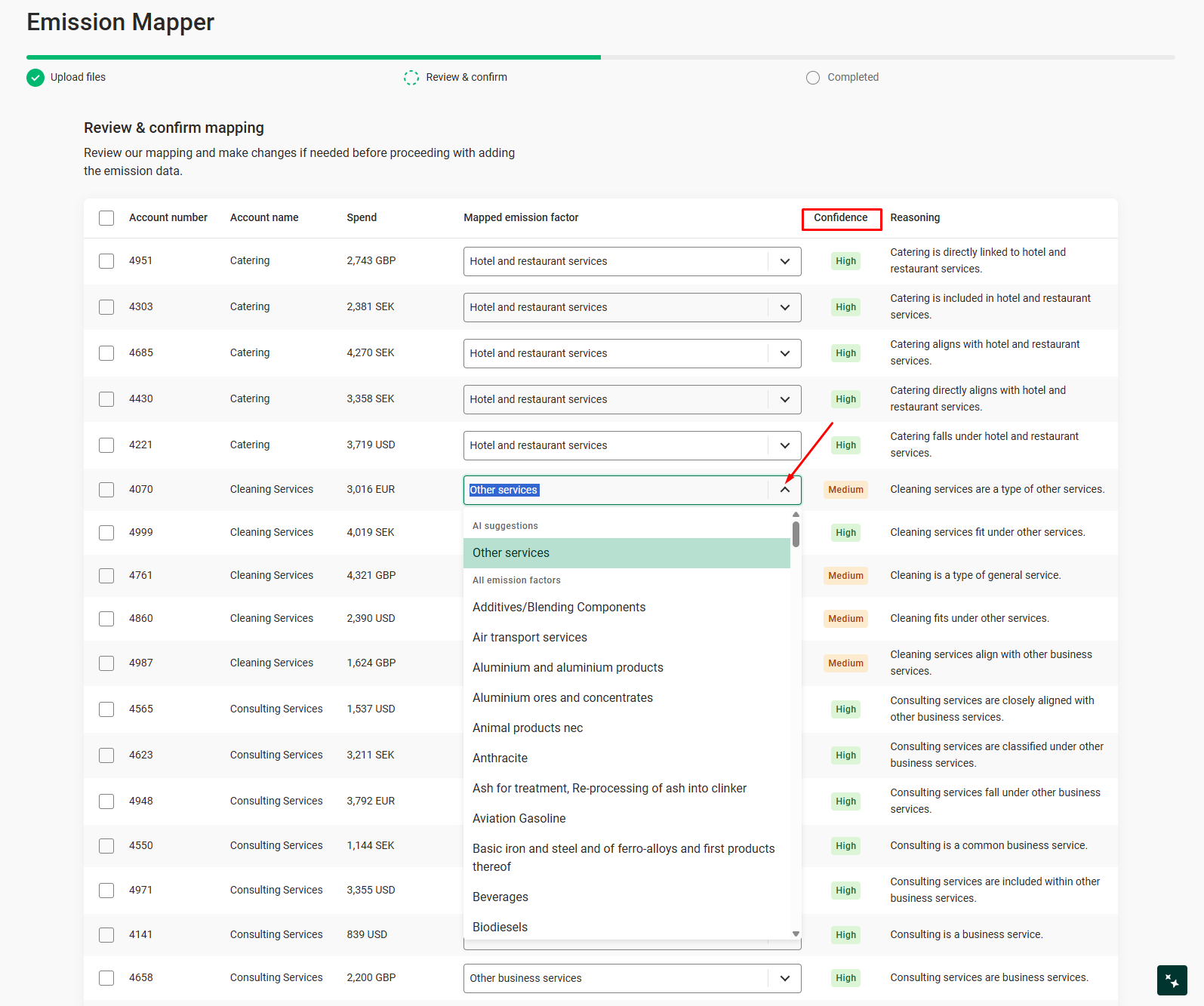 5. The Confidence label indicates the confidence of the AI mapping and it recommended to double check entries, especially those with label Medium or lower. Click the Mapped Emission factor for other suggestions in a dropdown menu.