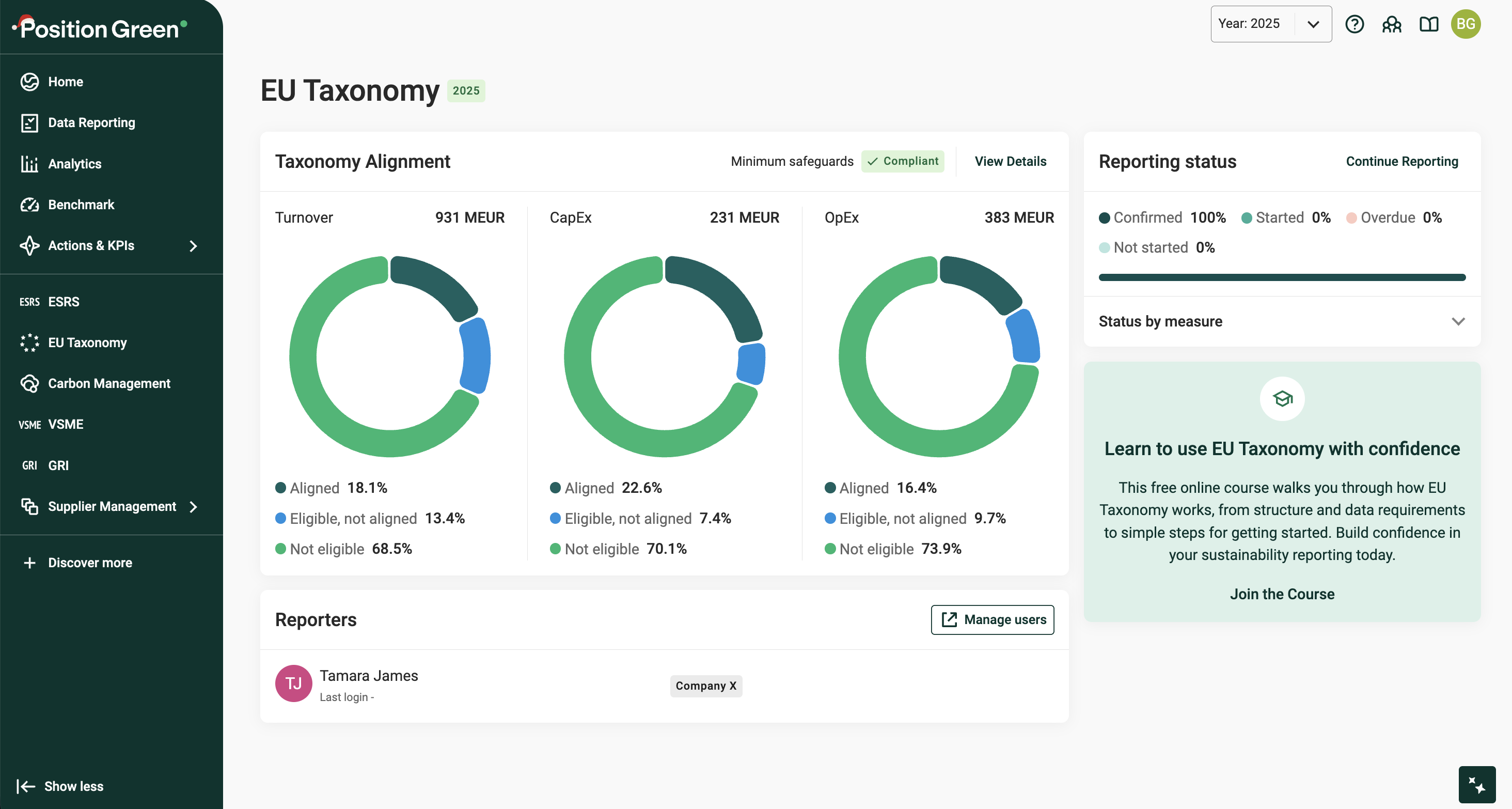 • Taxonomy Alignment: three widgets summarize the share of your Turnover, CapEx, and OpEx that is aligned, eligible but not aligned, non-eligible, and non-material (where applicable).