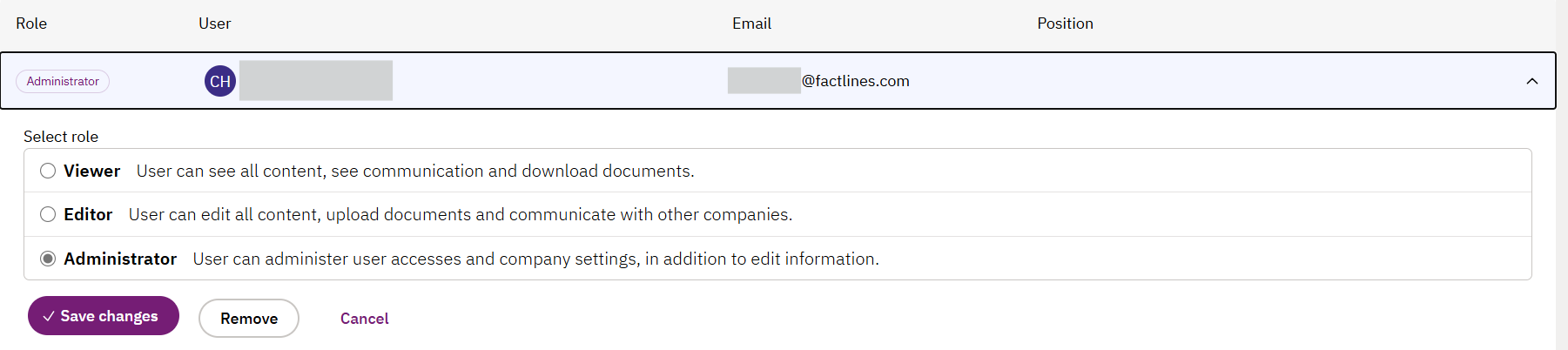 You can edit the access level (role) of a user or remove one or more users in your company account in Factlines. Here's how: