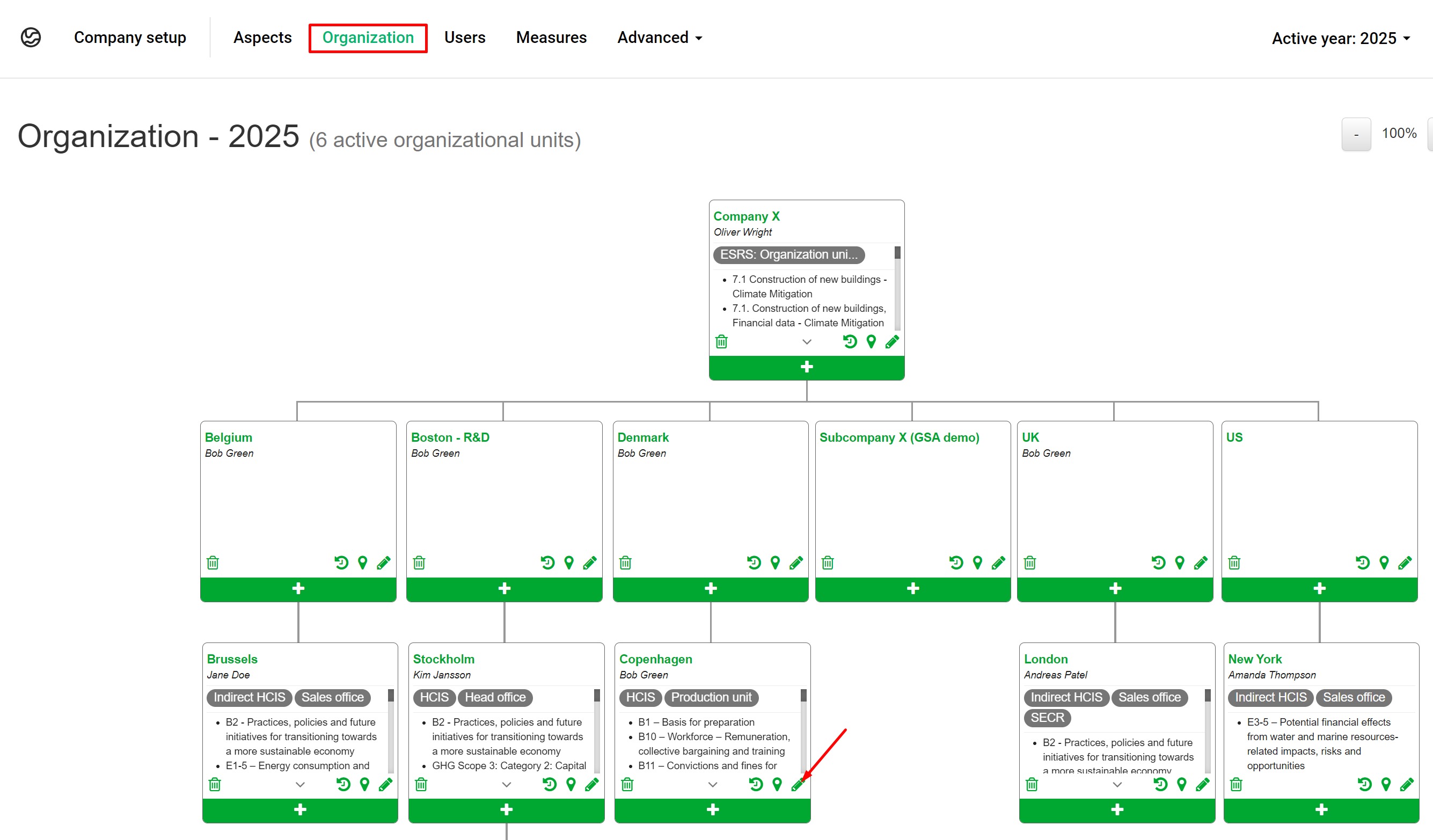 Par défaut, la responsabilité en matière de reporting est liée aux unités organisationnelles. Les superviseurs ou collaborateurs affectés à ces unités sont responsables de la soumission et de la confirmation des données. Cependant, les mesures peuvent également être configurées avec un rapporteur spécifique au niveau de la mesure.