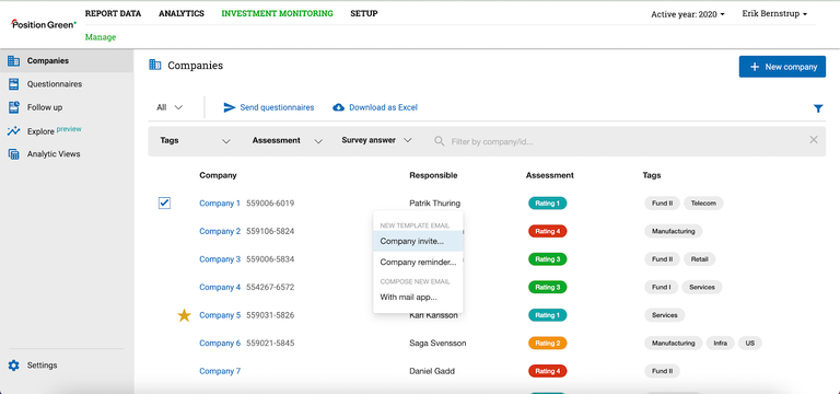 When creating a new company you can add a name, reference id, and a primary respondent for that company (the respondent can add collaborators, see questionnaire response view). You can additionally add Watchers when creating the company.