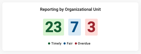 På startsidan illustrerar widgets olika datavärde i Position Green. Denna widget visar hur snabbt din org. enheter. Rapportering av Org. Enhet är ett genomsnitt av alla registreringar som är kopplade till en org. enhet.
