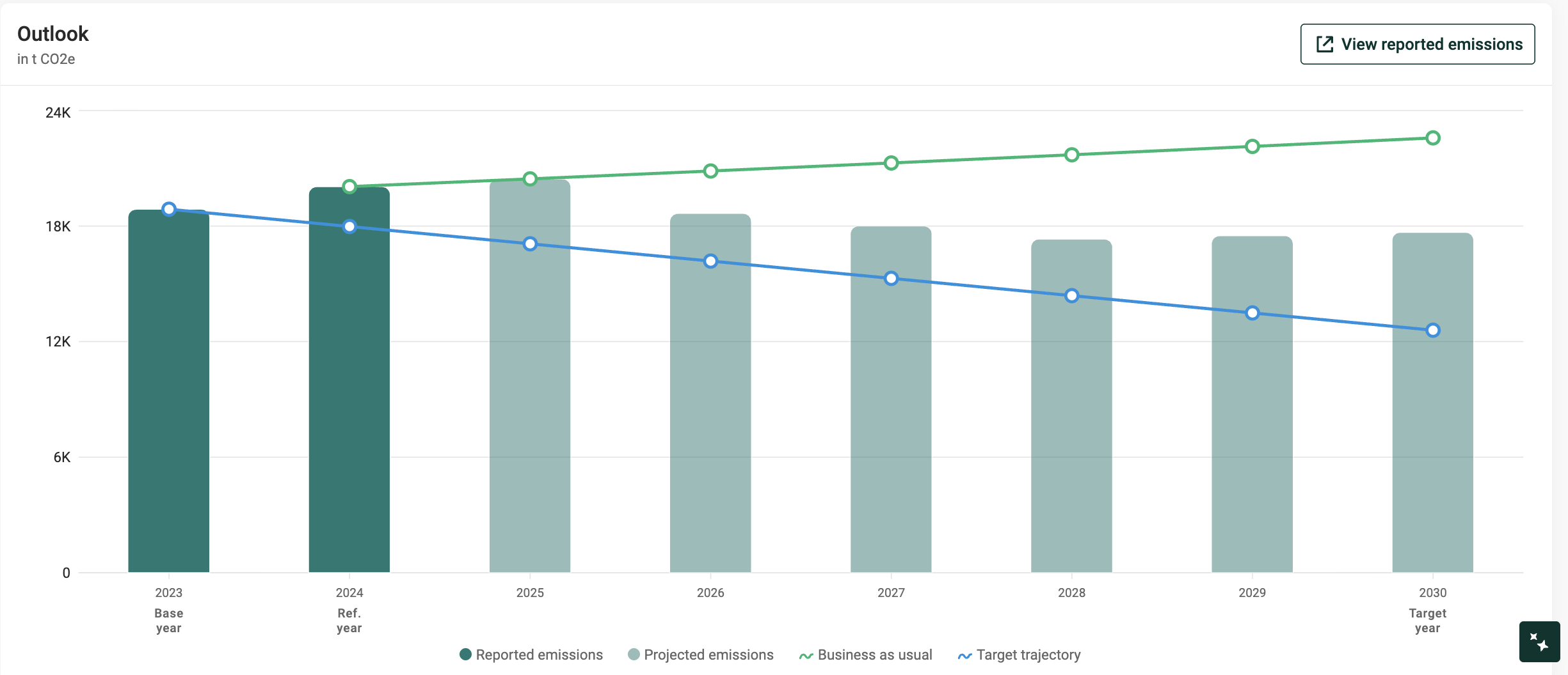 Outlook-diagrammet visar hur dina utsläpp utvecklas över tid. Den sammanställer dina historiska rapporterade utsläpp, prognostiserade utsläppoch målbanan, så att du tydligt kan se om dina planerade åtgärder är tillräckliga för att komma bort från business-as-usual och mot dina mål. Se [definitionslänk] för fullständig beräkning för dessa värden.