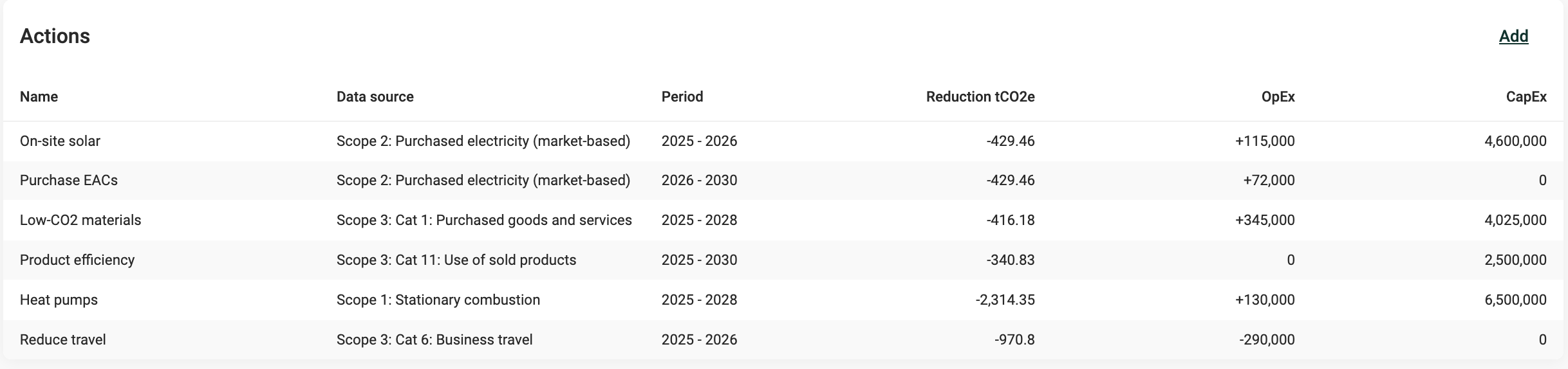 Åtgärder är konkreta åtgärder – som effektivitetsförbättringar, byte av bränsle eller användning av förnybara energikällor – som förändrar dina beräknade utsläpp. Lägg till en åtgärd för att ange dess konsekvens och tidpunkt, och se sedan hur din plan står sig mot ditt mål. Läs mer om hur du lägger till åtgärder här.