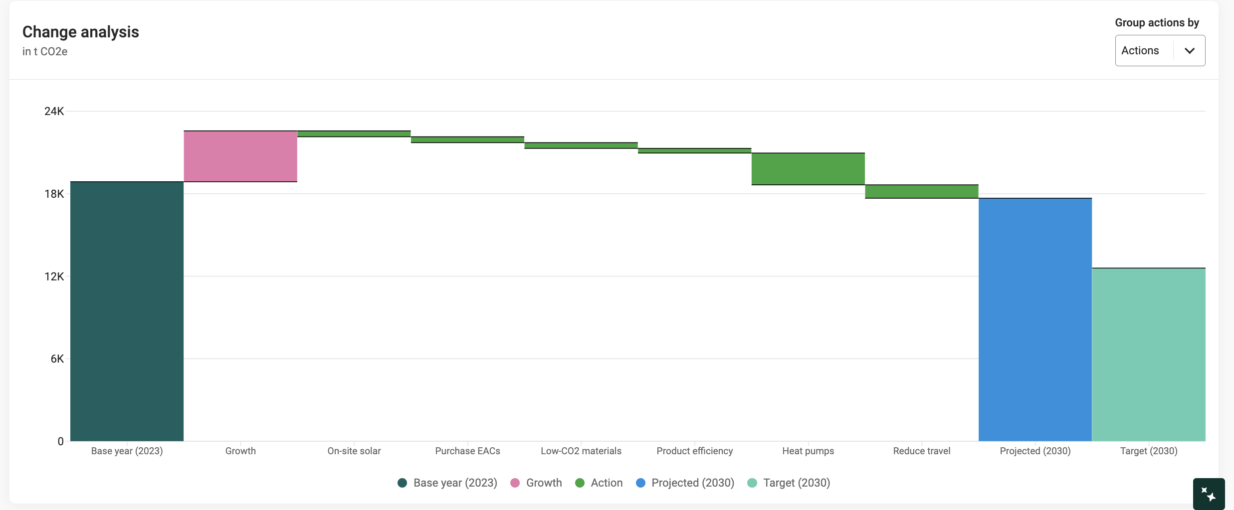 Åtgärder (grönt): minskningar som uppnåtts genom varje åtgärd eller omfattning i ditt scenario. Växla mellan olika översikter med användning av rullgardinsmenyn "Gruppera åtgärder efter".