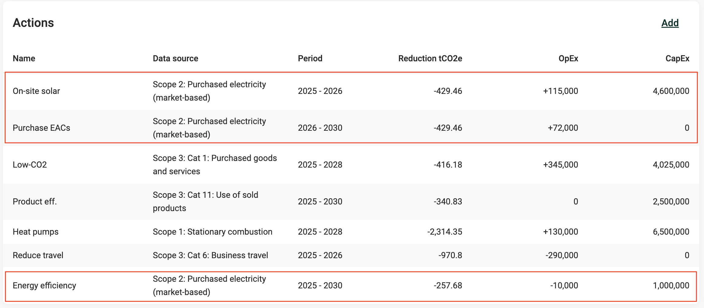 I detta fall är energieffektivitets åtgärder (257,68 tCO2e) i konflikt med de två första åtgärder i tabellen. För att åtgärda detta bör åtgärderna som riktar sig mot Scope 2: Inköpt electricitet granas och justeras, antingen genom att vissa åtgärder tas bort eller genom att parametrarna justeras.